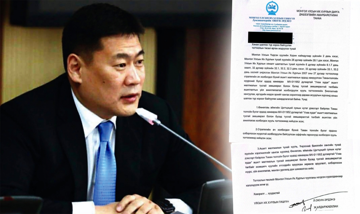 Төсөлд “…УИХ-ын 2007 оны 27 дугаар тогтоолоор баталсан стратегийн ач холбогдол бүхий ашигт малтмалын ордод хамааруулсан Тавантолгойн нүүрсний бүлэг ордод хамаарах MV-011952 дугаартай Ухаахудаг ашигт малтмалын лиценз болон бусад лицензтэй талбайн ашиглалтын үйл ажиллагаатай холбогдуулж хууль тогтоомжийн биелэлтийг хангуулах, иргэдийн мэдэх эрхийг хангах зорилгоор дараах асуудлын хүрээнд Хянан шалгах түр хороог байгуулах шаардлагатай байна. Үүнд, Өмнөговь аймгийн Цогтцэций сумын нутагт байрлах Тавантолгойн нүүрсний бүлэг ордод хамаарах MV-011952 дугаартай Ухаахудаг ашигт малтмалын лиценз болон бусад лицензтэй талбайн ашиглах үйл ажиллагаа холбогдох хууль тогтоомжид нийцсэн эсэх, мөн стратегийн ач холбогдол бүхий Тавантолгойн бүлэг ордоос олборлосон нүүрстэй холбогдуулж байгуулсан оффтейк гэрээнүүд холбогдох хууль тогтоомжид нийцсэн эсэх, түүнчлэн Ашигт малтмалын тухай хууль, Үндэсний баялгийн сангийн тухай хуулийн хэрэгжилтийг хангах хүрээнд Өмнөговь аймгийн Цогтцэций сумын нутагт байрлах Тавантолгойн нүүрсний бүлэг ордод хамаарах MV-011952 дугаартай Ухаахудаг лиценз болон бусад лицензтэй талбайг эзэмшигчдийн оруулсан хөрөнгө оруулалт, олборлосон нүүрс, үйл ажиллагаа, мөнгөн урсгалд дүн шинжилгээ хийх УИХ-ын тогтоолын төслийг нэгдсэн чуулганаар хэлэлцүүлж өгнө үү” гэжээ.