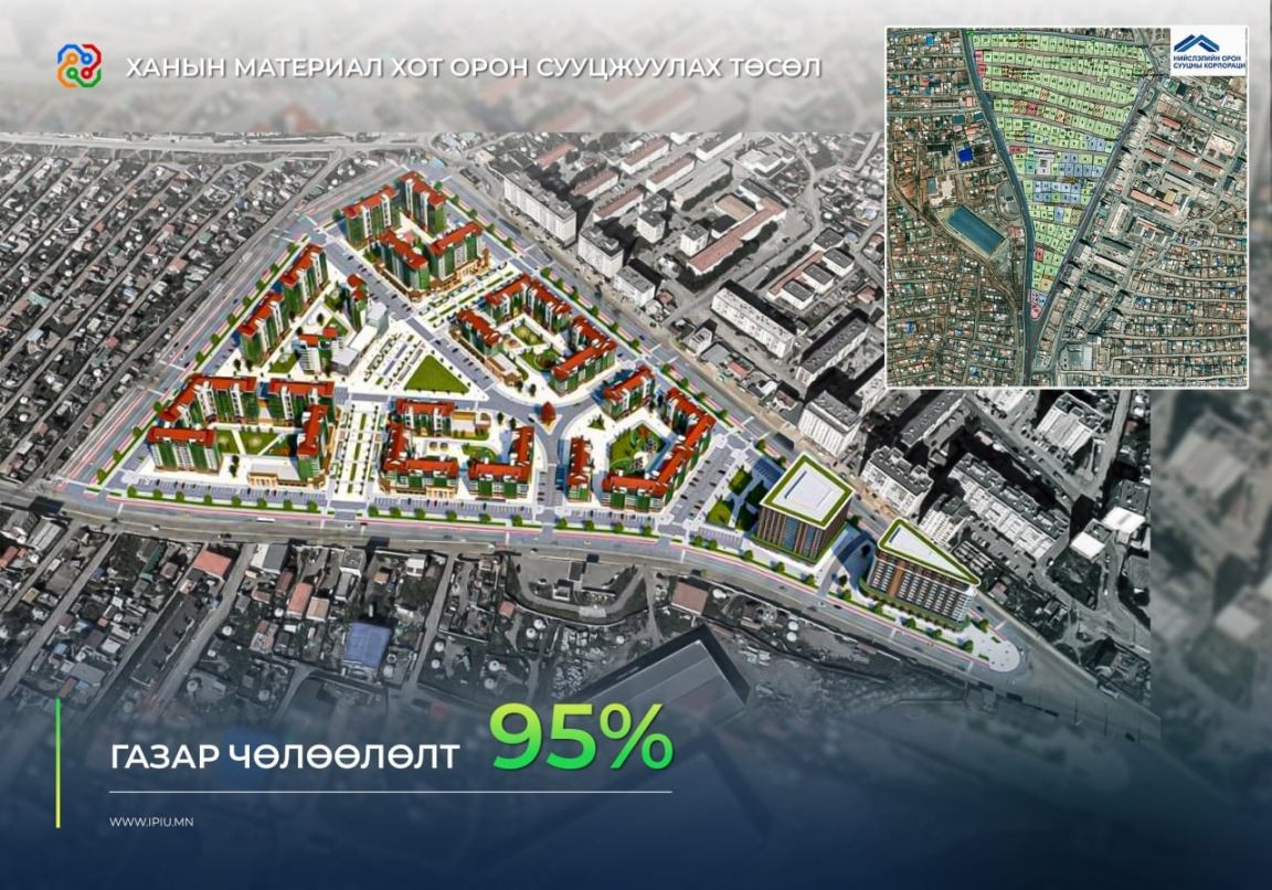 Сонгинохайрхан дүүргийн 5, 6, 7 дугаар хорооны нутаг дэвсгэрт байрлах Ханын материал орчмын гэр хорооллыг орон сууцжуулах төсөл хэрэгжиж байна. Төслийн нэгдүгээр үе шатанд 12.6 га талбайд 1800 айлын орон сууц, хоёрдугаар үе шатанд 1200 айлын орон сууцыг 8.1 га талбайд барина. Нэгдүгээр үе шатанд нийт 232 нэгж талбарыг чөлөөлөхөөс гүйцэтгэл 95 хувьд хүрээд байна.