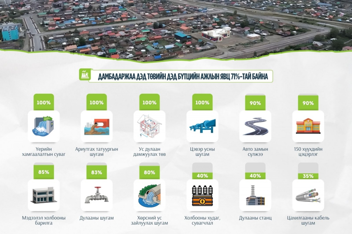 Нийслэлийн Засаг дарга бөгөөд Улаанбаатар хотын Захирагч Х.Нямбаатар “Дамбадаржаа дэд төв төслийн хүрээнд 800 нэгж талбарыг хамарсан дулааны шугам сүлжээ, цэвэр бохирын шугам сүлжээ, зам, нийгмийн барилга байгууламж бүхий төслийг хэрэгжүүлж, ирэх жил дуусгана. Тодруулбал, Дамбадаржаагийн дулааны станцын ажил ирэх жилийн наймдугаар сард дуусна. Үерийн хамгаалалтын сувгийн ажил дууссан. Мөн хөрсний ус зайлуулах ажил 80 хувьтай байна. 2.8 км авто зам барьсан. Өнөөдрийн байдлаар дулааны шугам сүлжээ татах, ус дамжуулах шугам сүлжээ барих ажлыг хийж байна. Барилгажилтын төслийн дагуу айл өрхүүдийн газрыг нөхөн олговортойгоор чөлөөлж, чөлөөлсөн 70 га газарт амины орон сууц барих төсөлд хувийн хэвшлийнхнийг татаж оруулахаар төлөвлөж байна. Сэлбэ голын эрэгт төвийн дулаанд холбогдсон хаус хорооллуудтай болно. Ирэх жилээс газар чөлөөлөлтийн ажлыг хийж, гүйцэтгэгчдийг сонгон шалгаруулна. Сэлбийн даланг 1966 оны үерээс хойш аж ахуйн аргаар хийж босгосон. БНХАУ-ын Засгийн газрын буцалтгүй тусламжаар Сэлбэ голын усны урсцыг сайжруулах, үерийн далан, тохижилтын ажлын төслийн гүйцэтгэгчийг ирэх жил эцэслэн сонгон шалгаруулна. Улаанбаатар хотын гэр хорооллыг орон сууцжуулах, дэд төвүүд байгуулах төсөл 2014 онд эхэлсэн. Өнөөдрийн байдлаар Баянхошуу, Сэлбэ, Шархад дэд төвүүдийн дэд бүтцийн ажлыг хийж дуусаад, барилга угсралтын ажил явж байна. Харин Дамбадаржаа, Толгойт дэд төвүүдэд дэд бүтцийн ажлууд хийгдэж байна” гэлээ.