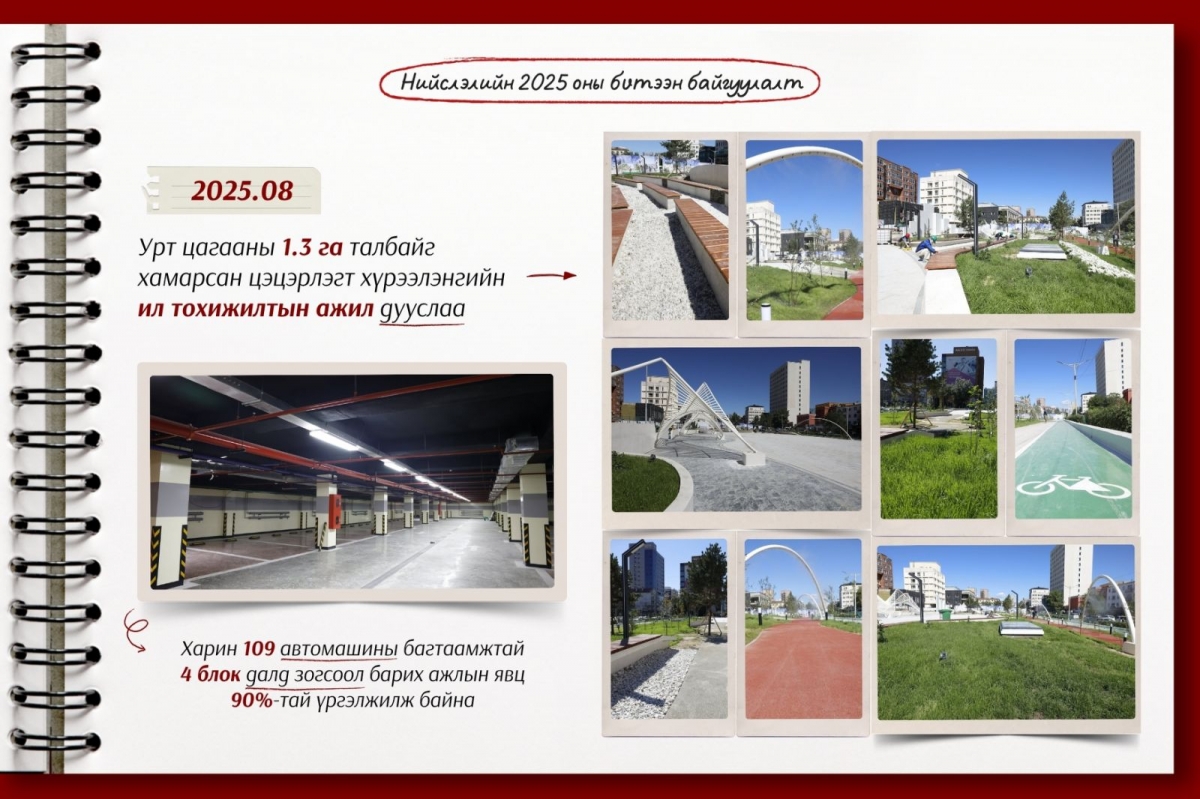 Чингэлтэй дүүргийн 3 дугаар хороонд “Урт цагаан” худалдаа, үйлчилгээний төвийн барилгыг 2024 оны арваннэгдүгээр сард нурааж, тухайн орчмын иргэдийн саналын дагуу далд зогсоол бүхий цэцэрлэгт хүрээлэн, үйлчилгээний төвийн цогцолбор барилга барьж буй. Өнгөрсөн наймдугаар сард 1.3 га талбайг хамарсан цэцэрлэгт хүрээлэнгийн ил тохижилтын ажил дууссан. Өнөөдрийн байдлаар 109 автомашины далд зогсоол, нийт тохижилт, гурван давхар үйлчилгээний төвийн барилга угсралтын ажлын явц 89 хувьтай үргэлжилж байна. Далд зогсоол барих ажлын явц 90 хувьтай байгаа юм. Гүйцэтгэгч “Бодь пропертийз” ХХК-ийн зүгээс цогц ажлыг 2025 оны арванхоёрдугаар сард багтаан дуусгахаар гэрээлсэн. Нийт төслийн талбайн 26.5 хувийг ногоон байгууламж эзэлж буйг онцолж байна.