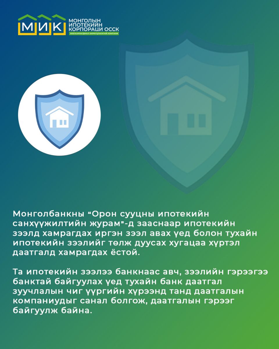 Монголбанкны “Орон сууцны ипотекийн санхүүжилтийн журам”-д зааснаар ипотекийн зээлд хамрагдах иргэн зээл авах үед болон тухайн ипотекийн зээлийг төлж дуусах хугацаа хүртэл даатгалд хамрагдах ёстой.