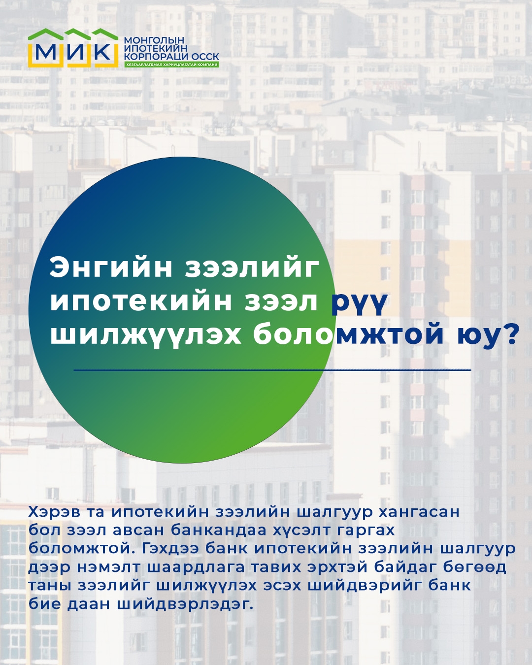 "Ипотекийн зээл” гэж баригдаж дууссан, улсын комисс хүлээн авч дүгнэлт гаргасан, улсын бүртгэлд бүртгэгдэж үл хөдлөх эд хөрөнгийн гэрчилгээгээр баталгаажсан үл хөдлөх хөрөнгө барьцаалсан орон сууцны зориулалттай зээлийг хэлнэ.