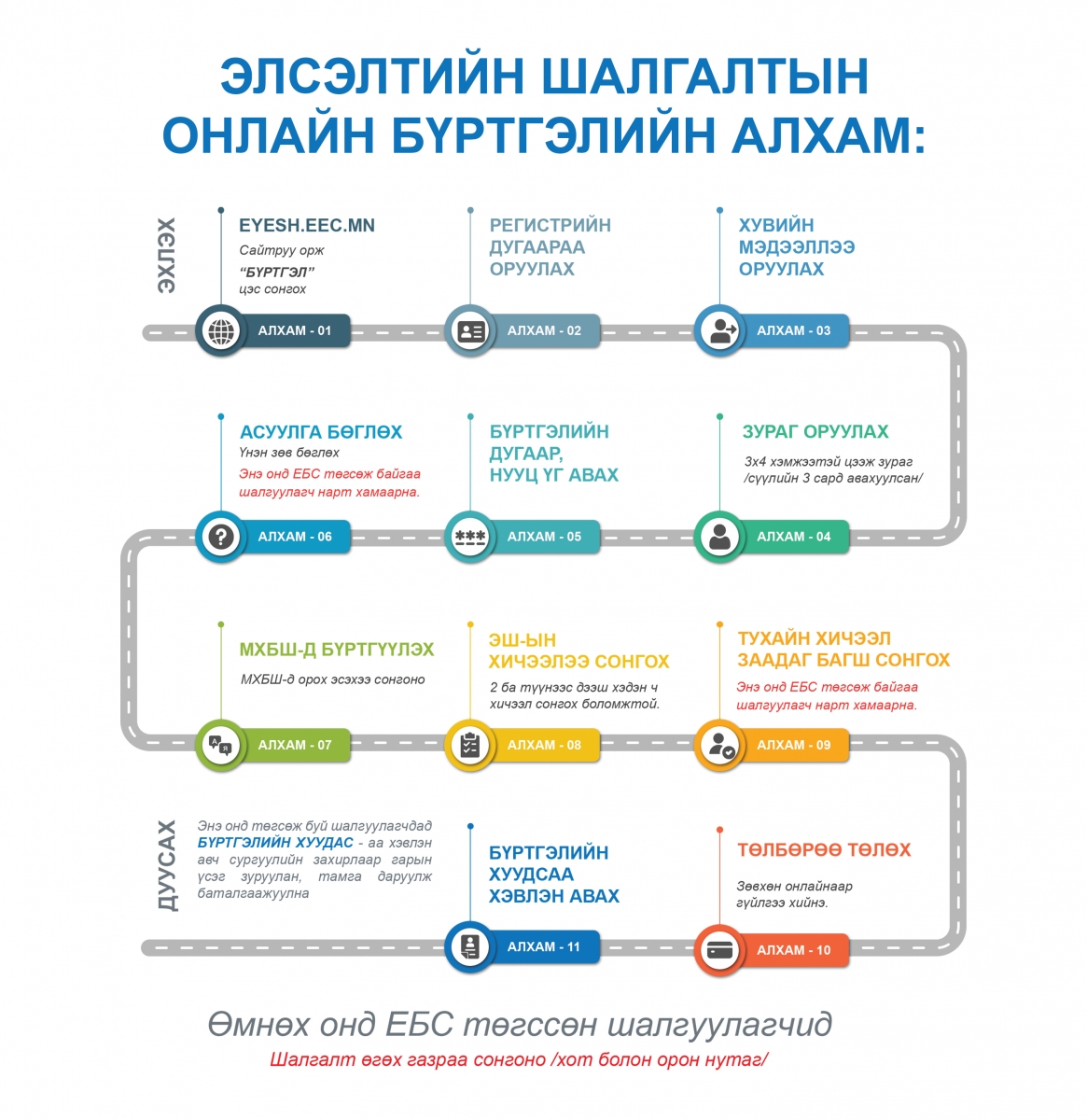 Энэ оны өвлийн элсэлтийн шалгалт арванхоёрдугаар сарын 4-7-нд зохион байгуулагдана. Шалгалтын бүртгэл энэ сарын 14-ний 18:00 цаг хүртэл явагдаж дууссан бөгөөд шалгалтын суудлын хуваарь гарчээ. Шалгуулагчид eyesh.eec.mn сайтын "Шалгуулагчийн булан"- гаар орж, бүртгэлийн дугаар, нууц үгээ ашиглан суудлын дугаараа хэвлэж авах боломжтой аж. Өвлийн шалгалтад дүн оноогоо ахиулахыг хүссэн, зургаадугаар сард зохион байгуулагдсан элсэлтийн шалгалтад орж чадаагүй, бүрэн дунд боловсролын гэрчилгээгээ авсан хүмүүс хамрагдах боломжтой.