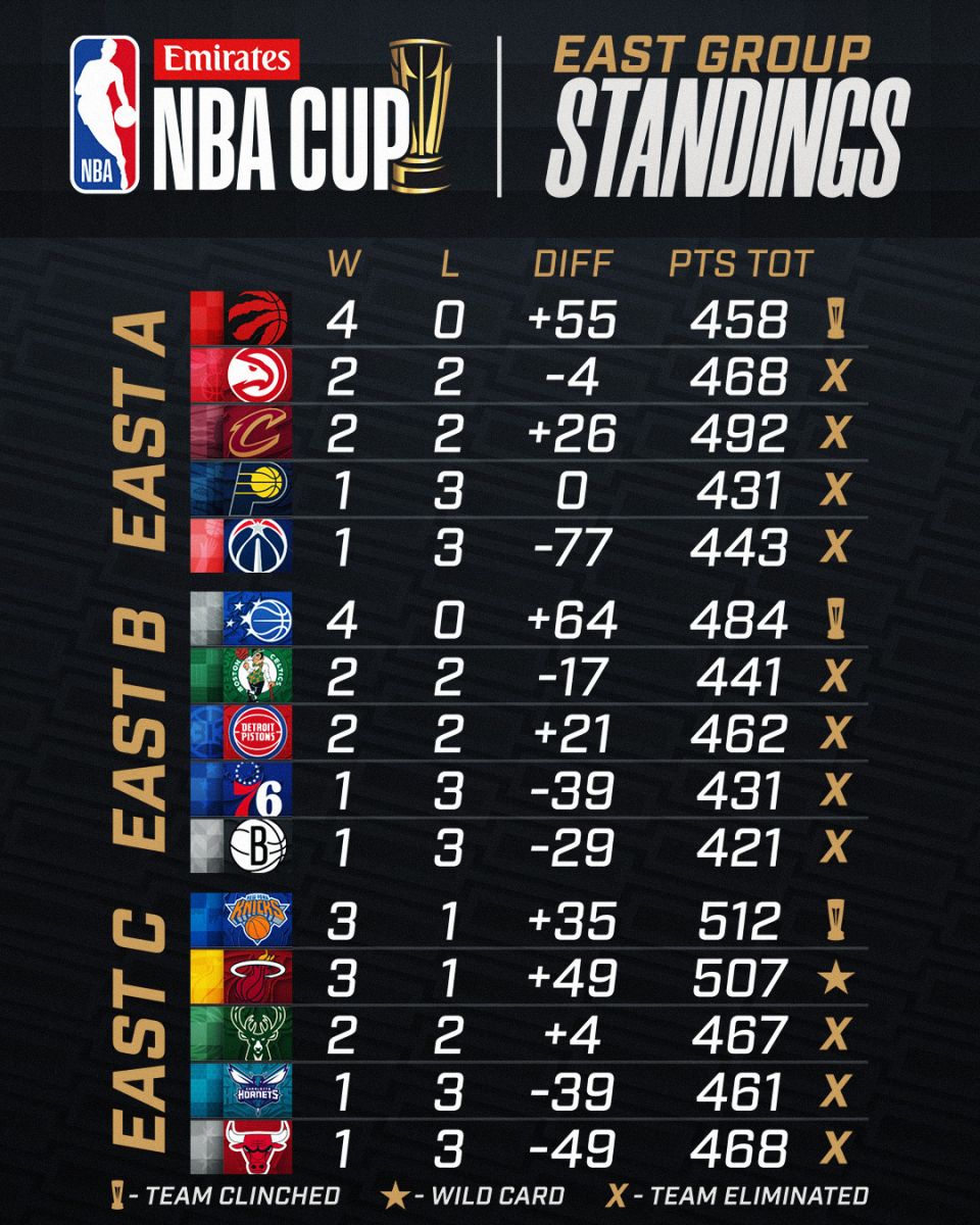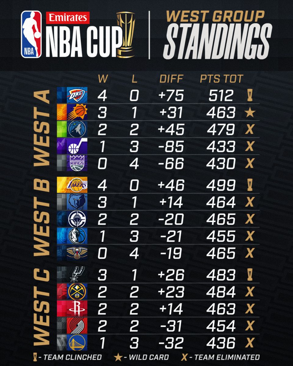 Мөн Лейкэрс улирал дундах "Emirates NBA Cup-2025" тэмцээнд дөрвөн хожилтойгоор өрнөд бүсийн хэсгээс гарч, хасагдах шатан Сан-Антонио Спөрс багтай учраа таарч байгаа бол Оклахома Сити Тандер болон Финикс Санс багууд нөгөө хэсэгт учраа таарсан байна. Харин дорнод бүсээс хасагдах шатанд Орлондо Межик, Миами Хит багтай учраа таарсан бол Торонто Репторс, Нью-Иорк Никс багтай учраа таарсан байна.