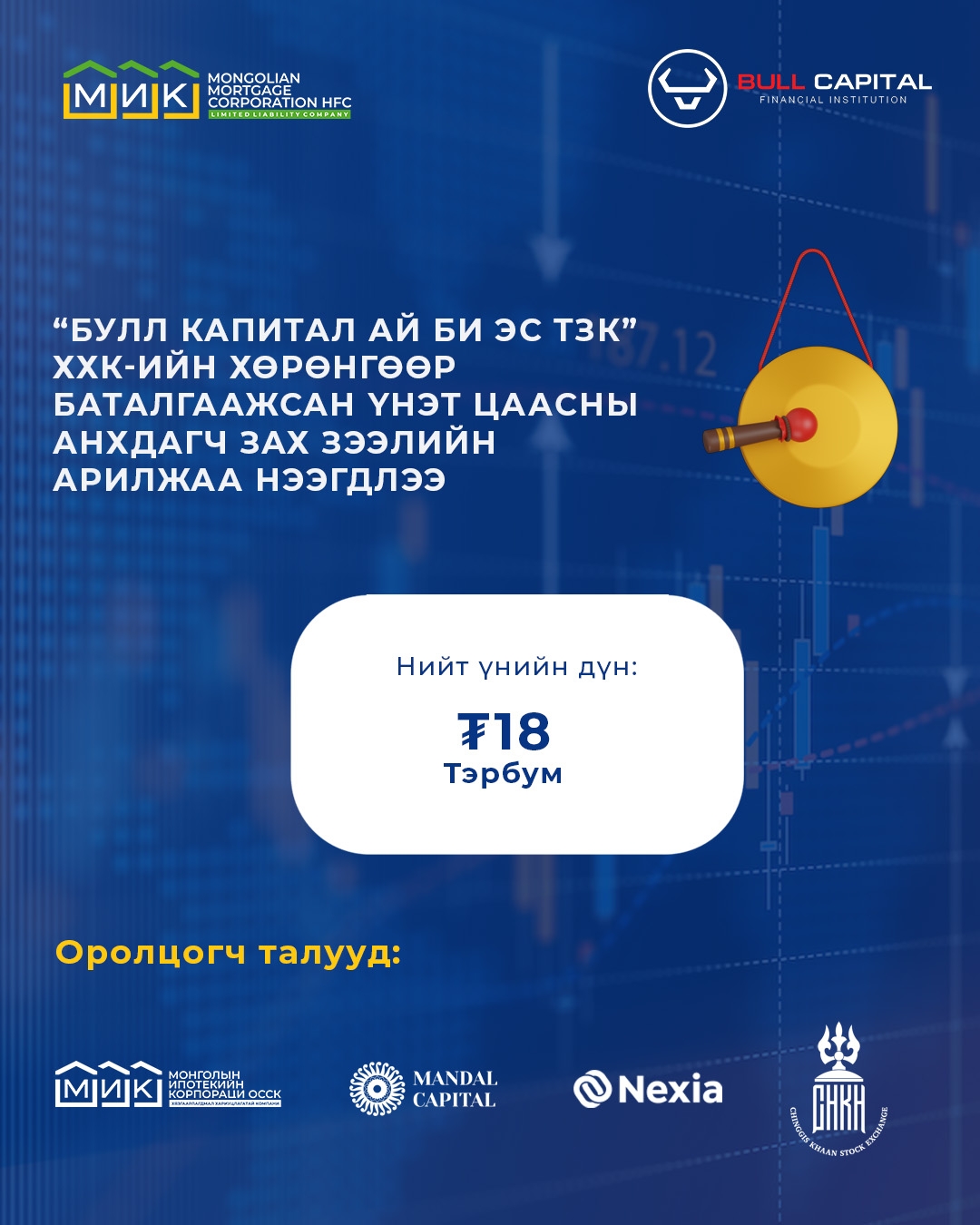 “Булл Капитал Ай Би Эс ТЗК” ХХК-ийн хөрөнгөөр баталгаажсан үнэт цаасны анхдагч зах зээлийн арилжаа нээгдлээ