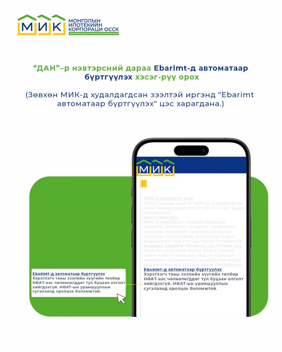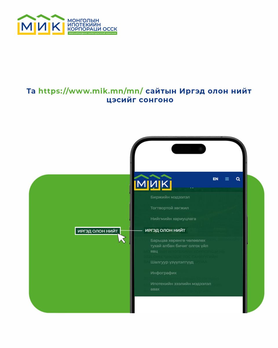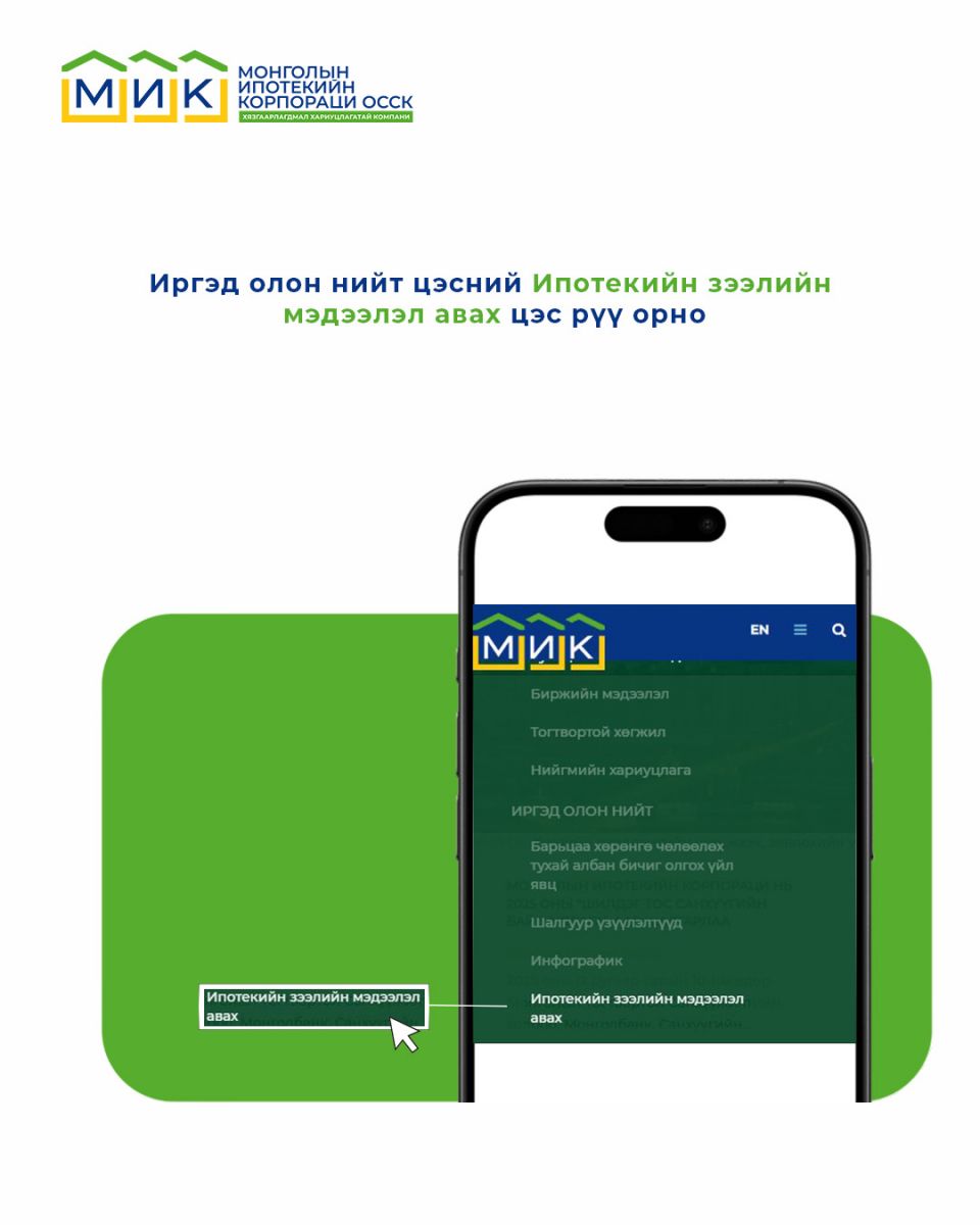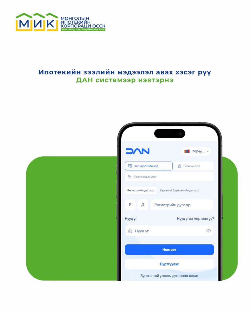 Та www.mik.mn веб хуудсанд нэвтэрч “Иргэд, олон нийт” цэснээс “Ипотекийн зээлийн мэдээлэл авах” хэсгийг сонгон, ДАН нэгдсэн системээр өөрийн регистрийн дугаараар нэвтэрнэ.